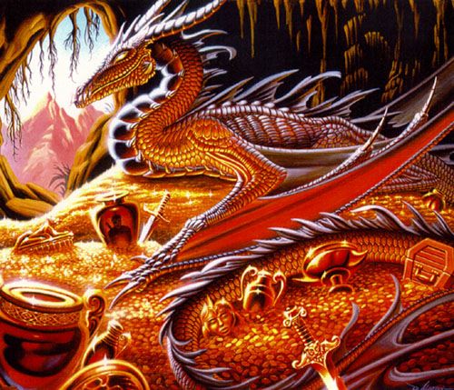 75690 On a pile of gold, in a cave.