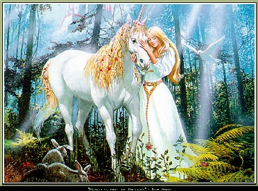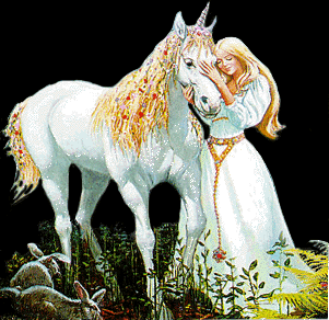 uni-keeper01.gif 256518 Animated - maiden stroking unicorn; rabbits foreground.