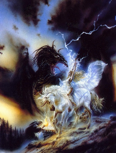 uni-wiz-small.jpg 110685 Unicorn, ridden by maiden; wizard and dark dragon - small