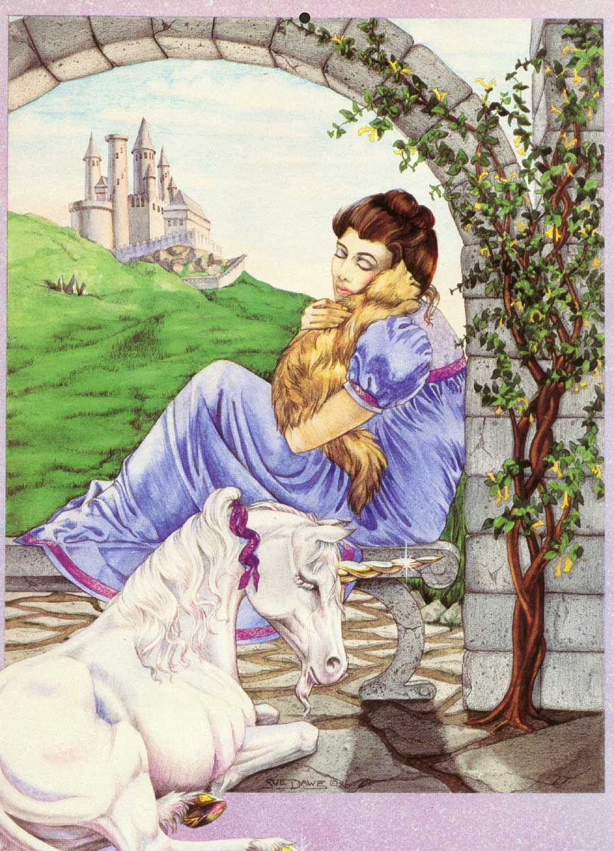 waitingforlove_suedawe.jpg 185728 Maiden holding cat, by unicorn, under arch, near castle
